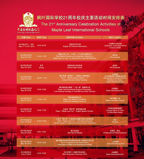枫叶教育集团21周年校庆主要活动时间安排表枫叶校庆先进的教育理念在实践中形成了独特的办学体系和极具特色的枫叶文化;凝聚成以诚信精神、创新精神、职业精神和执行精神为核心的枫叶精神。枫叶的办学成果受到国内外的高度关注,社会的广泛认可,枫叶学生成为枫叶教育理念的受益人。哈佛、麻省理工、剑桥、加州伯克利分校、多伦多等世界名校对枫叶毕业生的高素质给予了充分的肯定,并对枫叶的教学质量和办学理念大为赞叹。枫叶教育集团为中国的教育事业,为各地投资环境的改善,枫叶校庆为各地经济社会事业发展作出了贡献。