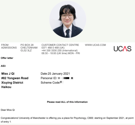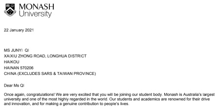 2021届高三学生祁俊仪收获QS世界排名第27位的曼彻斯特大学录取和QS世界排名第55位的蒙纳士大学录取!