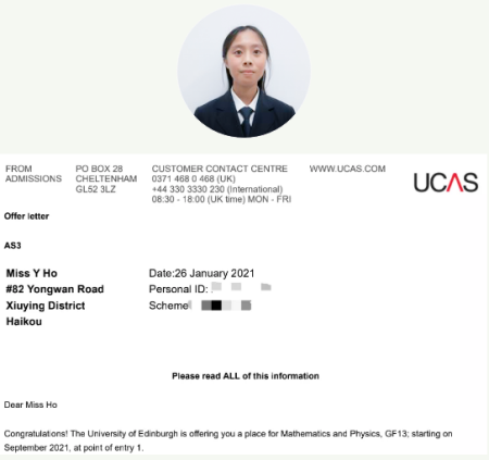 热烈祝贺:海南枫叶国际学校2021届高三学生何喻咏收获QS世界排名第20位的爱丁堡大学录取!