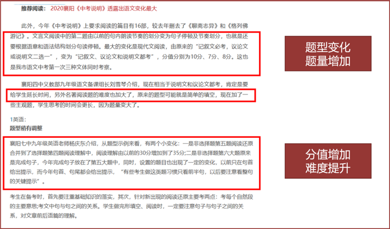 考试变化2020年襄阳中考各科形式均有变化,以语文和英语为例“语文:文言文阅读中的第二题由以前的句内朗读节奏的划分变为句子停顿及节奏划分,也就是还要根据语意和语法结构划分句读停顿。的变化是现代文阅读,由原来的“记叙文必考,议论文或说明文二选一”,变为“记叙文、议论文和说明文都考”,分值分别为10分、7分、8分。这也是我市语文中考次三种文体同时考察。另外名著阅读题的难度也加大了,原来的题型可能就是简单的填空,现在加了一些主观题,学生思考的时间会更长,因为题量变大了。