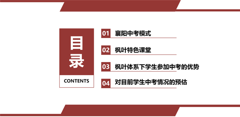各位亲爱的家长,大家晚上好,我是来着襄阳枫叶国际学校七年的的班主任周老师,今天由我带领大家解读“素质教育下学生参加中考的优势”,今天的内容主要分为以下4个板块:一、当前的襄阳中考模式、二、枫叶特色课堂,三、素质教育下学生参加中考的优势,四、对目前学生中考情况的预估。