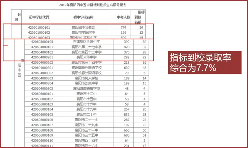 目前学生中考情况的预估这是2019年襄阳四中五中指标到校的数据表,通过去年数据显示:指标到校录取率综合为7.7%,两年后,枫叶的学子也会成为其中的7.7%。