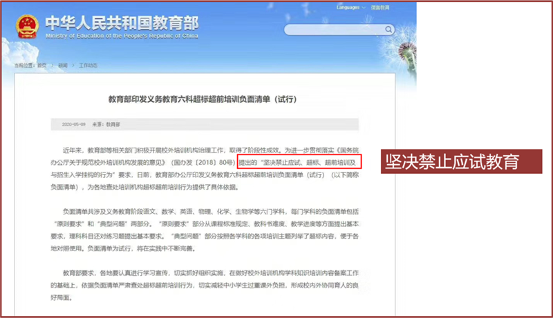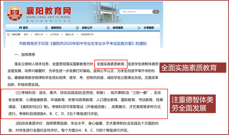 2020年5月,教育部发布义务教育六科超标超前培训负面清单,提出坚决禁止应试教育,襄阳市教育局在《2020年初中毕业生学业水平考试实施发方案中》提出“全面提出素质教育”,注重学生德智体美劳群面发展。